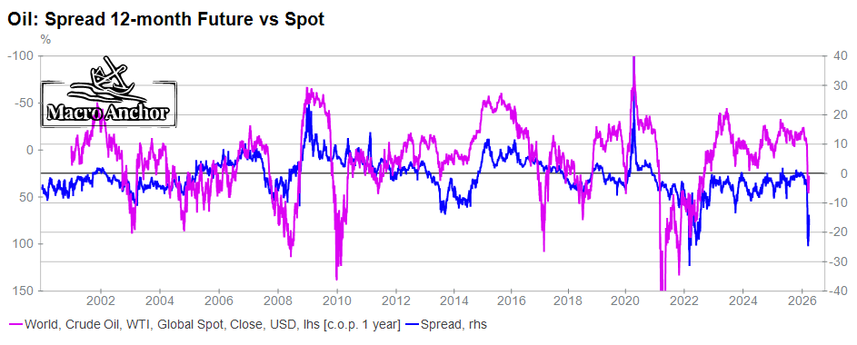 The oil market is already tightening, and the structure of the forward curve reflects that reality with unusual clarity. The first chart shows the spread between the 12-month forward price and the spot price, and what stands out is not simply that the market has moved into backwardation, but that it has remained there. This persistence signals that the system is short and that immediate access to physical barrels has become more valuable than future supply. In past cycles, this configuration has been closely associated with low inventories and rising prices, as the market begins to price scarcity before it becomes visible in headline data. The curve therefore acts as a leading indicator of physical tightening, compressing time and pulling supply forward.