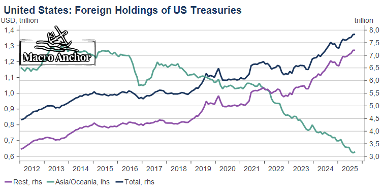 At that point, the consequences propagate through the system, reaching the U.S. Treasury market, where foreign central banks and sovereign entities have long played a structural role as buyers of American debt, and where even a marginal reduction in demand, less accumulation, slower recycling, greater diversification, can have profound effects, because the issue is not what is sold but what is no longer bought, and in a world of persistent U.S. deficits, the absence of that marginal buyer forces an adjustment, either through higher yields that attract capital at a cost, or through increased reliance on domestic absorption, with all the implications that entails for monetary policy, financial conditions, and economic stability, meaning a total monetization of the deficits.
