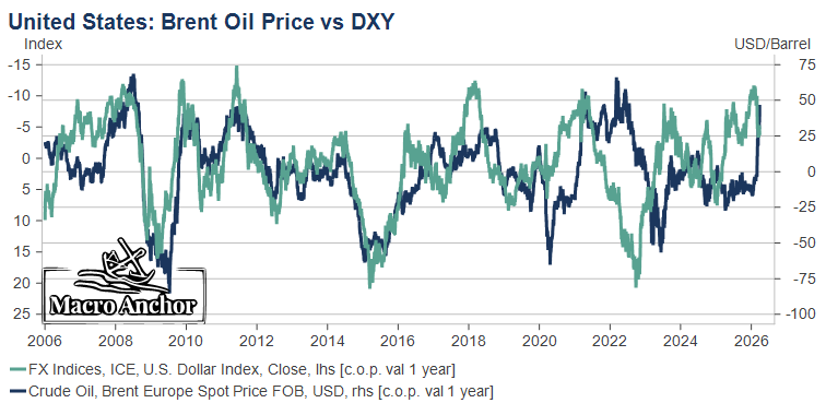 From that point onward, the system functioned with remarkable efficiency, because it created its own internal demand: every economy that needed energy needed dollars, every economy that sold energy accumulated dollars, and those dollars flowed back into U.S. assets, financing deficits that would have been unsustainable under any other arrangement, while at the same time stabilizing global markets through a mechanism that, for decades, manifested itself in the inverse relationship between the dollar and oil prices, a negative correlation that acted as a kind of pressure valve, since a stronger dollar tended to weigh on commodity prices by tightening global financial conditions, while a weaker dollar tended to support them by easing those conditions, thereby smoothing the shocks that would otherwise have destabilized the system.