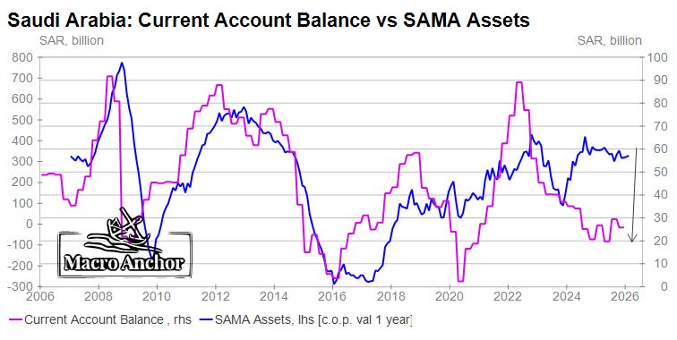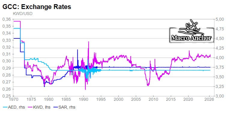 Oil does not cease to be traded in dollars overnight, nor do reserves suddenly vanish, but the assumptions that underpin those choices begin to erode. The first place this erosion becomes visible is in the exchange rate regimes of the Gulf states, whose currency pegs to the dollar, formally consolidated in 1983, central to the system, because they anchor domestic monetary conditions to the United States, enforce reserve accumulation in dollar assets, and ensure the continuity of the recycling loop, and yet these pegs are only sustainable under conditions of stability, stable revenues, stable capital flows, and above all, stable security, and when those conditions deteriorate, the cost of defending the peg rises until it collides with domestic economic needs, at which point the choice becomes unavoidable: maintain the peg and sacrifice flexibility, or abandon the peg and redefine the system.